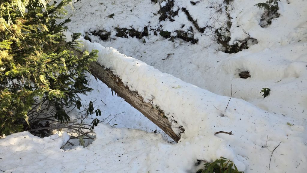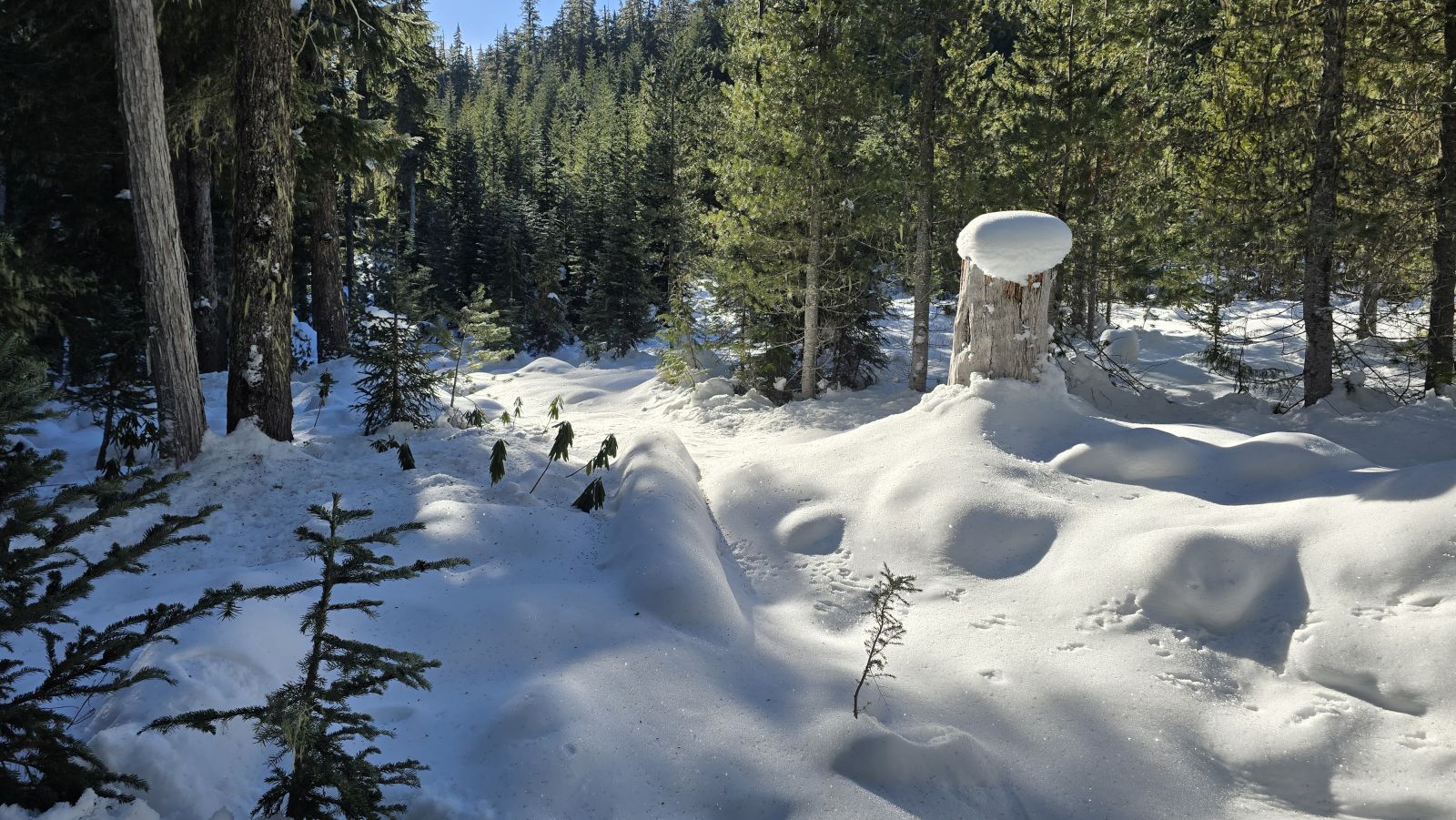 It was 24 degrees when I started - cold but crisp. No real snow at the start. Snow mostly started where trail enters the old cut. From there up to Fadeaway springs the trail was covered and in some places pretty deep. The great news is that the first 2+ miles of the trail are clear of blowdown. There are only a half dozen past that and they are all pretty small - nothing significant. Great bluebird day on a great old trail!